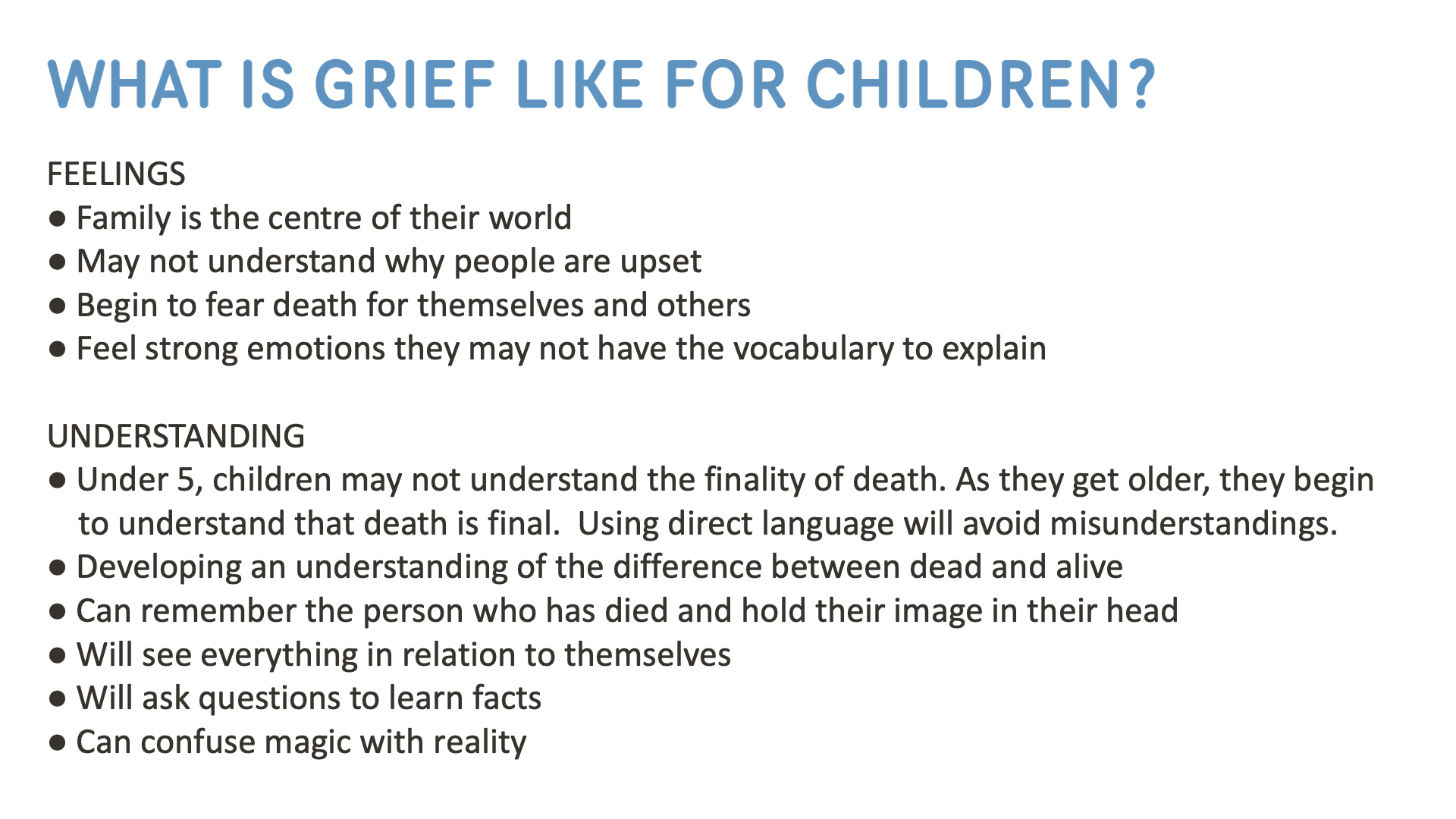 Knowing this foundation of grief will help an educator in school meet a bereaved child where they are in both their understanding on death and the feelings they are experiencing. Both change and develop over time, but knowing the child and these foundations of grief will better equip educators to know what to do to best support that child’s bereavement specific needs.
