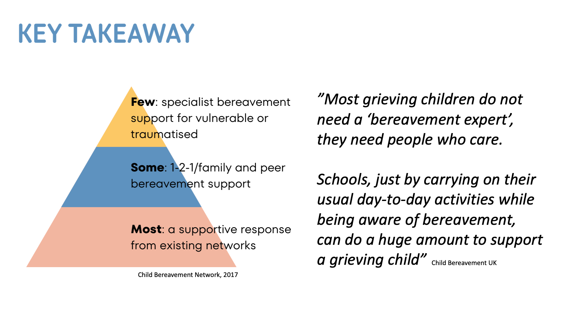 On the left hand side is a diagram of a triangle taken from Child Bereavement Network. It shows from research what they consider good support for bereaved children looks like. The bottom largest section of the triangle says that most children need, “a supportive response from existing networks” of which school is a large part.